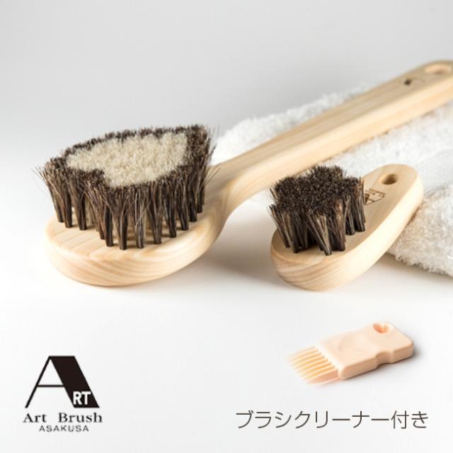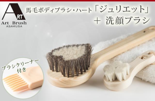 馬毛ボディブラシ・ハート「ジュリエット」+洗顔ブラシ。柔らかいタッチが特徴のボディブラシ・ジュリエットは女性におすすめ。泡立ち抜群の洗顔ブラシをセットにしてお得な価格でご提供いたします。お手入れに便利なブラシクリーナー付き。ブラシ職人が造る白馬毛と茶馬毛を使用した高品質のブラシ。アートブラシは140年余りの歴史を持つものづくりの街、浅草に於いて初代より数えて100余年、ブラシ一筋で技術を磨いてきました。