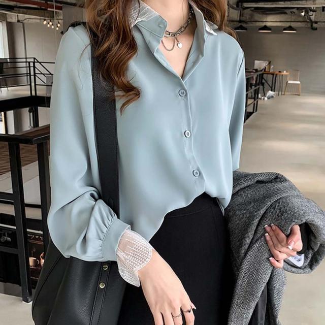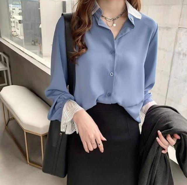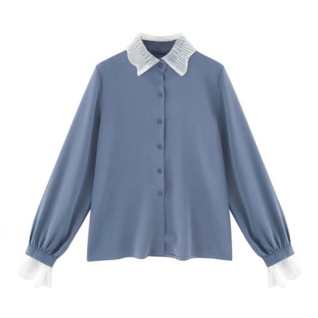 秋 レディース 秋 トップス 秋 2019 ブラウス シャツ バイカラー オシャレ オフィスカジュアル 長袖 レース ブルー グリーン レッド ベージュ