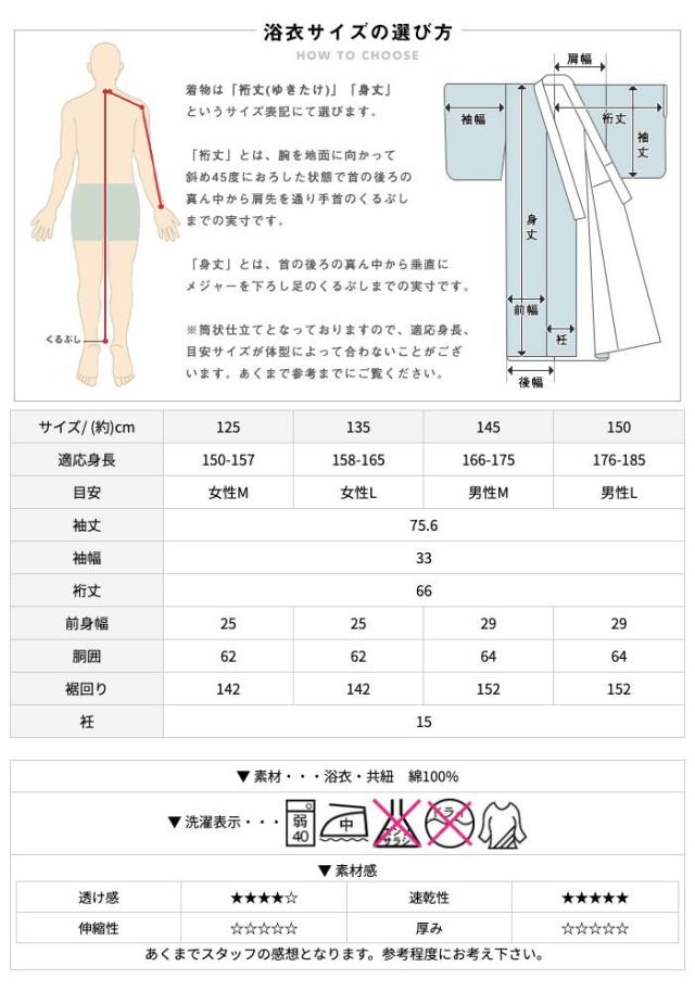 サイズ:適応身長/目安/袖幅/裄丈/前身幅/胴囲/裾回り/衽