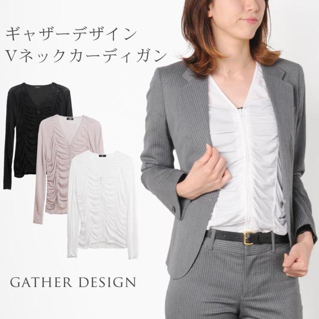 Vネック カーディガン ファスナー 開閉 シャーリング ギャザー デザイン レディース(No.2316-1)