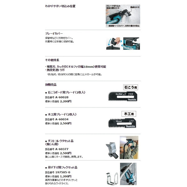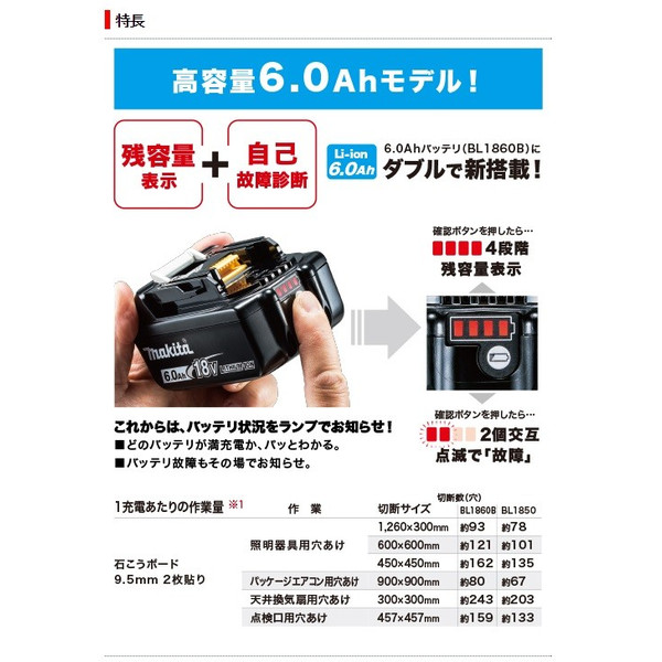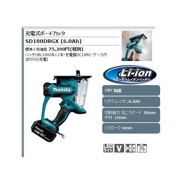 マキタ 充電式ボードカッタ コードレス リチウムイオンバッテリ6.0Ah バッテリBL1860Bx2本 充電器 ケース付 SD180DRGX 18V対応 特