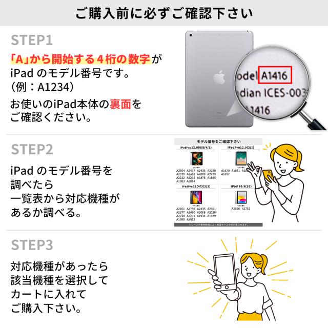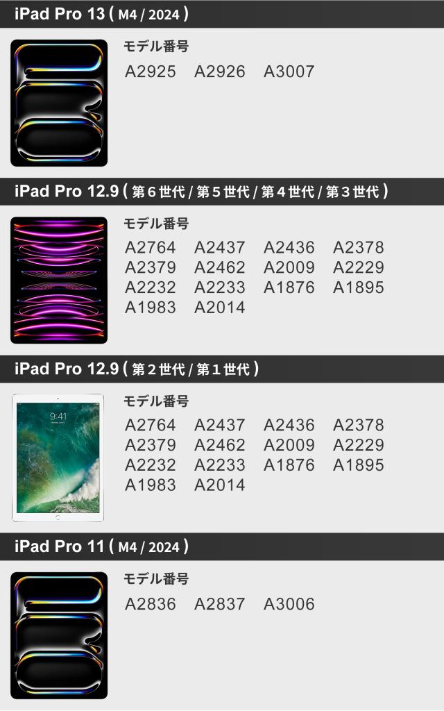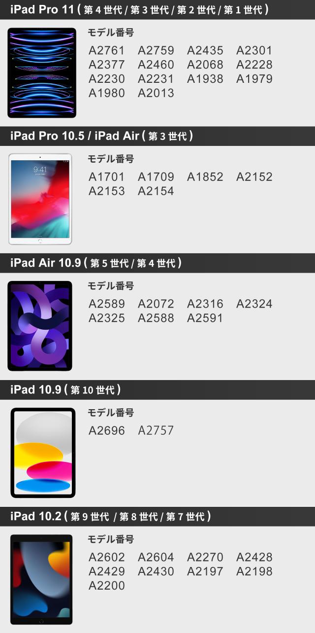 | APPLE iPad mini APPLE iPad mini 2 APPLE iPad mini 3 APPLE iPad mini 5 APPLE iPad mini 6 iPad 9.7 iPad 10.2 iPad 10.9 iPad Air iPad Air 2 iPad Air 10.2 iPad Air 10.5 iPad Air 10.9 ( 第10世代 第5世代 第4世代 ) iPad Pro 11 M4 ( 2024 ) iPad Pro 9.7 iPad Pro 10.5 iPad Pro 11 ( 第4世代 第3世代 第2世代 第1世代 ) iPad Pro 12.9 ( 第1世代 第2世代 ) ホームボタン有 iPad Pro 12.9 ( 第6世代 第5世代 第4世代 第3世代 ) ホームボタン無 iPad Pro 13 M4 ( 2024 ) |