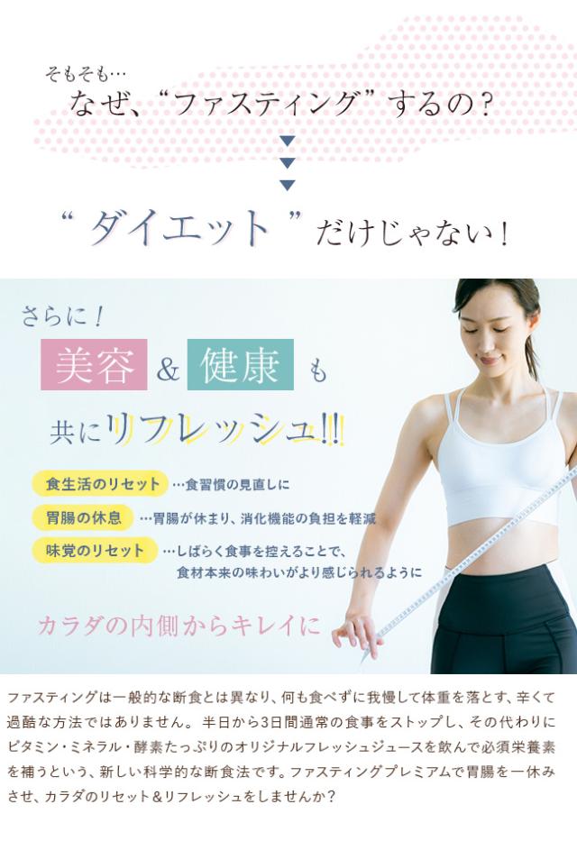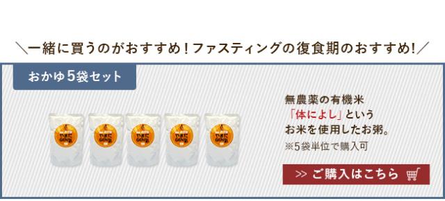 | 注意 | ※ディスプレイの環境上、実際のカラーが再現できない場合がございます。 ※ファスティングは、実施されるご本人の自己管理・自己責任において行なってください。 ※ファスティング中は本品とは別に、1.5リットル程度のミネラルウォーターを飲んでください。 ※持病がある方は掛かりつけの病院でご確認ください。 |