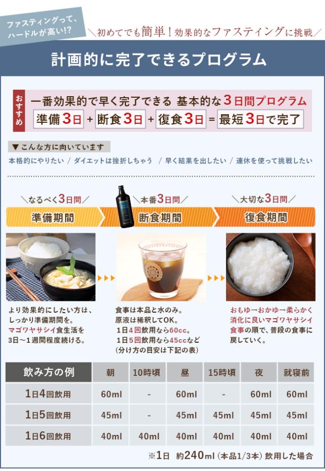 【注意】※ファスティングは、実施されるご本人の自己管理・自己責任において行なってください。※ファスティング中は本品とは別に、1.5リットル程度のミネラルウォーターを飲んでください。※持病がある方は掛かりつけの病院でご確認ください。