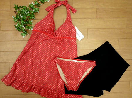 水着 レディース 送料無料 タンキニ 3点セット 9M パンツ付 U-HEART ホルターネック ドット柄 赤 白 女性 9号 (s11253-1)