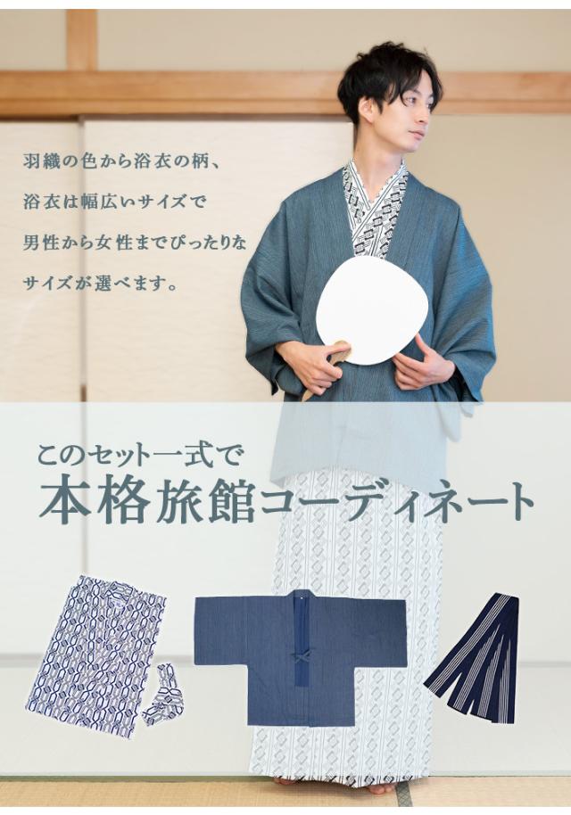 実際に旅館やホテルなどで使用されている定番旅館浴衣(寝間着仕立て浴衣/宿浴衣)4点セットです。