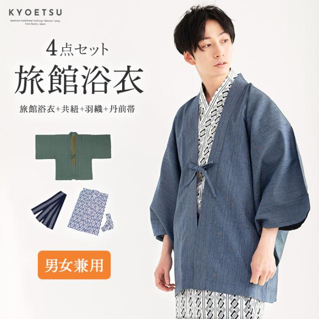 (旅館浴衣 4点セット) 旅館浴衣 浴衣 寝巻き 5colors 羽織 帯 丹前帯 寝間着 寝巻 男性 女性 メンズ レディース 介護 パジャマ 温泉浴衣 入院着 ペアルック(rg)