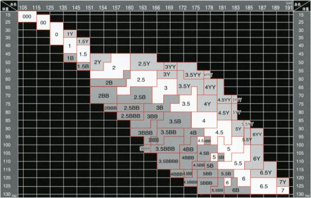 ※Y、Bが2つ以上ついたサイズ(5BB、3YYYなど)と6B以上のサイズは別注となります。