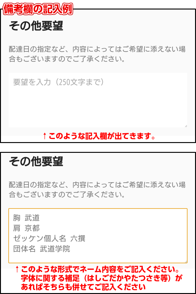 ・備考欄に個人名(ゼッケン上部)、団体名(ゼッケン下部)をご記入ください。