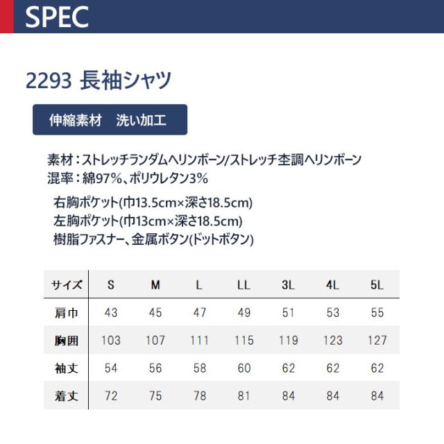 長袖シャツ ジーベック 2293 ストレッチ 作業服 作業着 春夏 XEBEC ユニフォーム 4L-5L 2294シリーズ 大きいサイズ