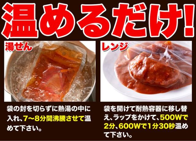 ・原材料名:ハンバーグ、野菜[玉ねぎ、じゃがいも(遺伝子組み換えでない)、人参、生姜、にんにく]、トマトペースト、豚脂、小麦粉、還元水あめ、デミグラスソースベース、ビーフエキス、食塩、全脂粉乳、トマトケチャップ、ウスターソース、しょうゆ、香辛料、加工でん粉、調味料(アミノ酸等)、着色料(カラメル、ベニコウジ、ラック)、pH調整剤、香料、香辛料抽出物、(原材料の一部に鶏肉を含む)・殺菌方法:気密性容器に密封し、加圧加熱殺菌
