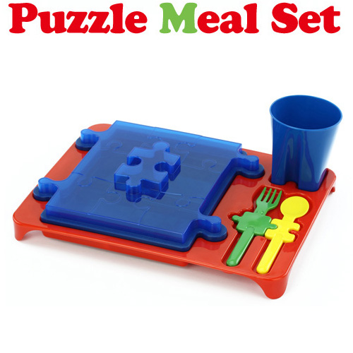 おいしく食べながら、認識力や思考力もアップ!?パズルで遊ぶのが大好きな子供たちにうれしいスプーン、フォーク、マグ、フタがパズルになった楽しいランチプレートセット★