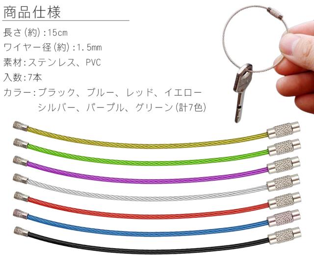 ワイヤーキーリング 7本セット キーチェーン キーホルダー ステンレス ロックワイヤー 15cm 1.5mm PR-WKR7【メール便 送料無料】