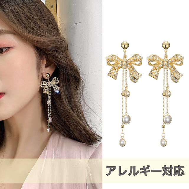 ピアス レディース パールリボン ロングピアス 揺れる アレルギー対応 ポイント消化 誕生日 母の日 プレゼント