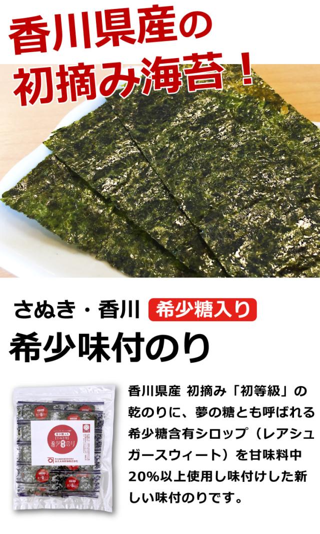 ■商品詳細:香川県産 初摘み「初等級」の乾のりに、夢の糖とも呼ばれる希少糖含有シロップ(レアシュガースウィート)を甘味料中20%以上使用し味付けした新しい味付のりです。