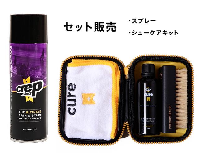 | Crep Protect Water Resistant Spray & SHOE CURE KIT SET クレップ プロテクト 防水 スプレー & シューケアキット セット 世界で最も販売されているシューズ用防水スプレー。 2012年にイギリス・ロンドンにて設立され、シューケアブランドとして全世界を席巻している【crepprotect】。 米国のスニーカーイベントにも参加し実演でその効果を披露するなど積極的なマーケティング活動を行うほど 効果が実証されているシューズ用防水スプレーとして有名。 世界の著名なスニーカーショップはもとより、 スニーカーフリークやコレクターなど多くのマニアを虜にしている究極のレジスタント・バリアーです。 簡単で使いやすく、シューズを色々な汚れから守る、スニーカー系の商品に適した防水スプレー。 天然皮革や合成皮革、スェード、ヌバック、キャンバス、ナイロン等シューズに使用されている素材に対応可能。 優れた撥水効果で、水や汚れを徹底的に弾き濡れやシミからガードします。 ※必ず目立たない部分でテストしてからご使用下さい。 ・革によっては色落ちする可能性もございますので、まずは目立たない部分でお試しください。 使用が可能かどうかの判断は、各製品メーカーまたは製造元に問い合わせ下さいませ。ご使用後に色落ちやシミなどが生じた場合、交換、弁償はお受け致しません。 ・ケア用品はパッケージなどの都合上、お客様都合でのご返品はお断りさせていただきます。 ※仕様変更により、日本製からドイツ製に変更されました。 それに伴い撥水力も上昇しておりますが、 濃度が濃くなった分若干のセメダイン臭が感じられる場合がございます。 ※生産、入荷時期によってはデザインや仕様の変更がある場合があります。 ご了承の上、お買い求めくださいませ 【特徴】 優れた撥水効果で、シューズの風合い、通気性をそのままに 水・油汚れをはじき、濡れ、ハネ、汚れからしっかりとガードします。 【使用方法】 1.靴の汚れを落とす。 2.ご使用前にスプレー缶をよく振ってください。 3.20cm程度離した所から全体にふきかける。 4.30分程、乾かします。 5.再度、20cm程度離した所から全体にふきかける。 6.そのまま30分程、乾かしたら完成です。 シューケアキット 【特徴】 レザー、スウェード、ヌバック、キャンバス、ナイロン、ビニールなど様々な材質の素材に対応する究極の靴クリーナー、シュークリーナー・高級ブラシ・マイクロファイバークリーニングクロスのセット、デザイン性に優れたパッケージ 【用途】 天然皮革、スウェード、ヌバック、キャンバス、ナイロン、 シューズに使用されているあらゆる素材に対応可能 【使用方法】 1.ボウルに張ったあたたかい水にブラシを浸す。 2.適量の洗剤をブラシにつける。 3.ブラシをもう一度水に浸す。 4.泡立たせながら汚れている箇所をブラッシングする。 5.マイクロファイバーのタオルなどでキレイに拭き取る。 6.必要に応じてこの工程を1〜5回繰り返し乾燥させる。 ※スウェードやヌバックを洗浄する際の注意として、ブラッシング前に出来る限りの水気を落としてください。 ※染色してある素材は水に触れただけで色落ちをする素材もあります場合もあります。 目立たない部分で試してご使用ください。 ※マイクロファイバー・クリーニングクロスは入荷時期により変更がある場合があります。 ご了承の上、お買い求めくださいませ。 1本はコチラ、2本セットはコチラ、3本セットはコチラ、6本セットはコチラ シューケアキットはコチラ | ||||