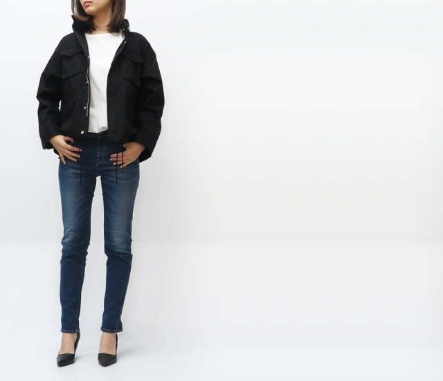 アイコニックなシルエットを描くミリタリージャケットは、ヴィンテージを思わせるM-65のディテールを表現し、テープ使い、収納型のフードなど細部にまでこだわっています。袖を通した時に生まれるテントシルエットは女性らしさをプラスしてくれます。また、裾を絞る事でバルーンシルエットに変化。それぞれのコードを調整する事であらゆるスタイリングに対応します。
