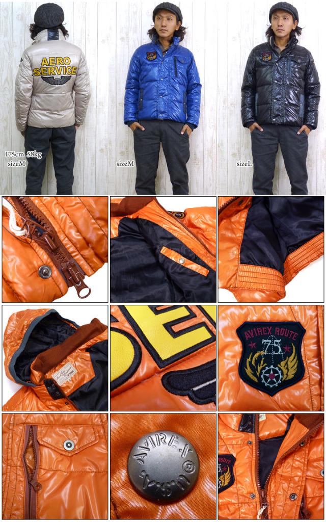 << 【AVIREX】 PADDING T.A.F. JACKET >> アビレックスの2012年ミリタリージャケットの登場です!今年は今年はTHIRD AIR FOCEベース。バックにはシンプルながらインパクトのある「AERO SERVICE」のメッセージ入り。合皮を切り替えた高級感のあるデザインです。左肩や右胸にもワッペンが貼られており非常にAVIREXらしさを感じさせるデザインです。ボディはシャイニーカラーが特徴的なシレナイロンを使用、程よく中綿が入っており防寒性とシルエット感にこだわった作りです。アクセントと実用性を兼ね備えたジップポケットとフラップ付きポケットを装備。バックの襟元にもアクセントに。更に襟元はフードインタイプで、ウール混のリブを採用した機能性にも長けたアイテム。<着用モデル>身長175センチ 体重58キログラム サイズMを着用しています。