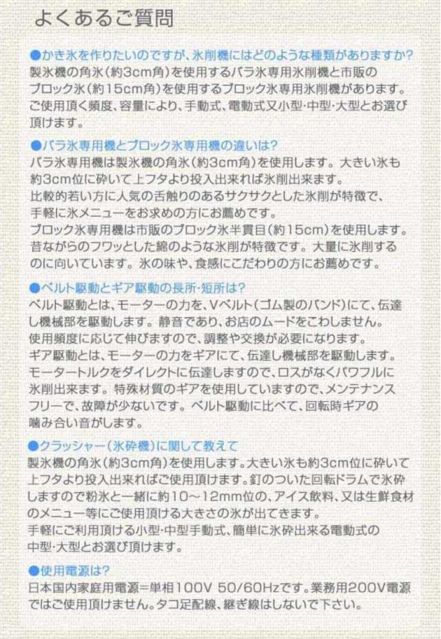 | 備考 | ※かき氷専用です。クラッシュアイスは作れません。 駆動方式:手動式 粗さ調節:不可 氷削能力:0.2標準(kg/min) 円盤有効径:120mm |