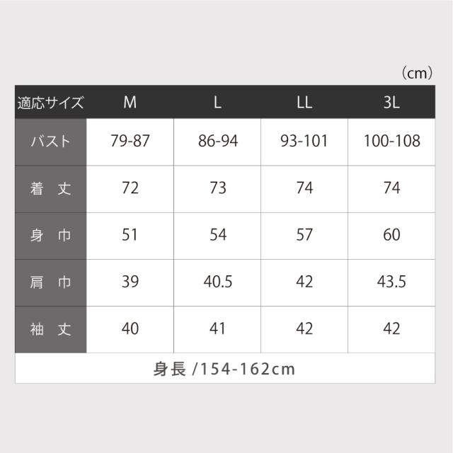 ■サイズ:身長154-162、M/バスト79-87、身丈72、身幅51、肩幅39、袖丈40、L/バスト86-94、身丈73、身幅54、肩幅40.5、袖丈41、LL/バスト93-101、身丈74、身幅57、肩幅42、袖丈42、3L/バスト100-108、身丈74、身幅60、肩幅43.5、袖丈42cm