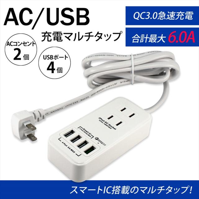 スマホ 充電器 スマートIC搭載 USBマルチタップ QC3.0 AC 2ポートUSB 4ポート 30W 1.5m jx-ac-179 PSE認証【宅配便のみ】