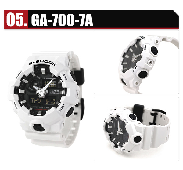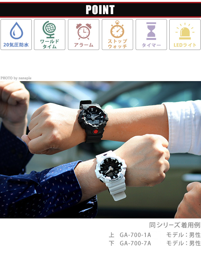 7年保証キャンペーン G-SHOCK アナデジ メンズ 腕時計 G-SHOCK-GA-700 カシオ Gショック コンビネーション 時計 選べるモデル ◆タフネスを追求し進化を続けるG-SHOCKから、アナログとデジタルのコンビネーションモデルにモデルGA-700が登場。G-SHOCKのフェイスアイコンでありタフネスを象徴するフロントボタンを6時側に配置。Newベーシックと呼ぶにふさわしい、先進性とエッジを利かせたダイナミックなスタイリングによる仕上げを施しました。独自の樹脂成形技術による立体的な時分針には、金属を削り出したような力強く、厚みのあるボールドハンドを採用。視認性を向上しながらタフネスデザインにふさわしい、新しい造形に仕上げました。また、ダイアルリングやインデックスを立体的に表現し、ボールドハンドとの相乗効果による進化した3Dフェイスデザインです。コンビネーションモデルの実用性に加え、フロントボタン操作によるスーパーイルミネーターや針退避機能など高いユーザビリティも兼ね備えています。 国内品番:GA-700-1AJF GA-700-1BJF GA-700-2AJF GA-700-4AJF GA-700-7AJF 海外品番:GA-700-1A GA-700-1B GA-700-2A GA-700-4A GA-700-7A