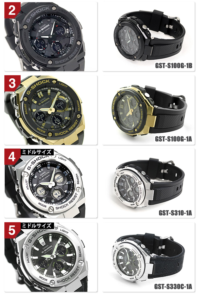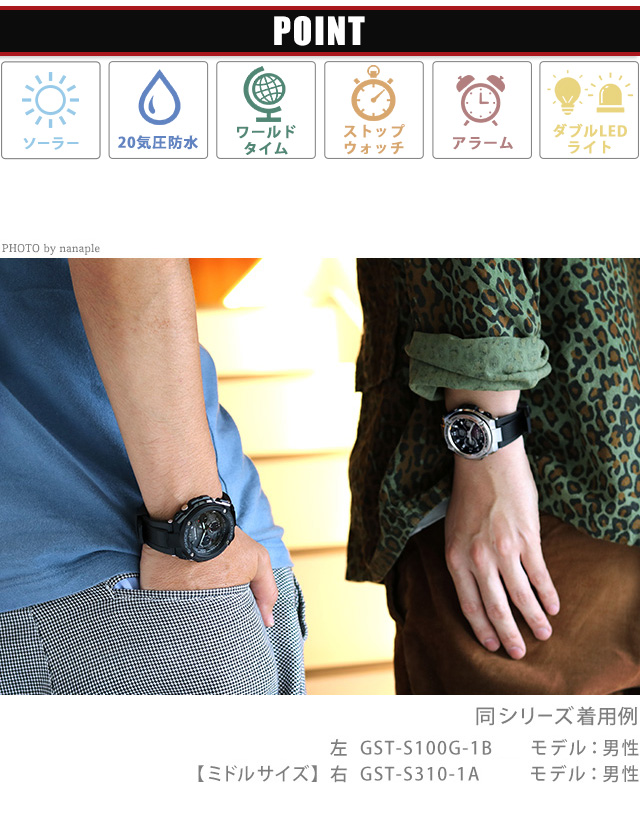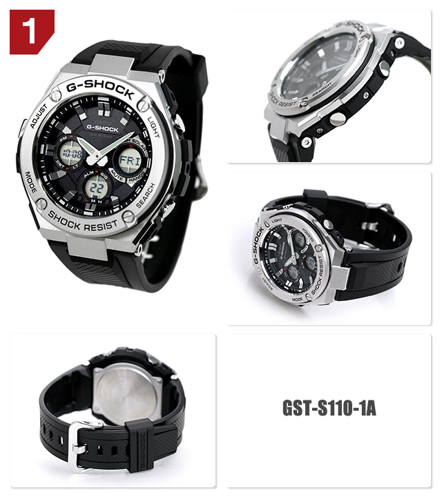 7年保証キャンペーン G-SHOCK ソーラー Gスチール メンズ 腕時計 G-SHOCK-GST-S G-STEEL アナデジ Gショック 時計 選べるモデル ◆タフネスを追求し進化を続けるG-SHOCKから、新たに「レイヤーガード構造」を採用した「G-STEEL(Gスチール)」が登場。また、デザインバリエーションを広げるミッドサイズも登場。ベゼル部に異なる素材を用いて、二層のレイヤー構造にすることにより新たな耐衝撃構造を実現。ベゼル上部にメタル(ステンレス)を使用した場合は下部に緩衝体となる樹脂、また上部に樹脂を使用した場合は下部にファインレジンを組み合わせることで、上部からの衝撃を緩衝する耐衝撃構造を新開発。これによりデザインの幅を広げました。文字板を明るく照らすダブルLEDライトも搭載しています。新しい構造により、タフネスデザインのバリエーションの幅を広げた、新シリーズ「Gスチール」の登場です。 ※当モデルは電波機能はありません。 【1】 GST-S110-1A 【2】 GST-S100G-1B 【3】 GST-S100G-1A 【4】 GST-S310-1A 【5】 GST-S330C-1A 【6】 GST-S300-1A 【7】 GST-S300G-1A2 【8】 GST-S300G-1A9 【9】 GST-S300G-2A1