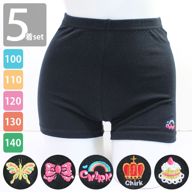 【5枚セット】キッズ 女の子 子供 オーバーパンツ 1分丈 レギンス スパッツ / アンダーパンツ インナーパンツ ブラック 黒 カワイイ刺繍入り 卒業式 入学式 通園 通学