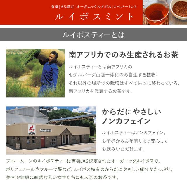 ブルームーンのルイボスティーは有機JAS認定されたオーガニックルイボスで、 ポリフェノールやフルーツ酸など、ルイボス特有のからだにやさしい成分がたっぷり。