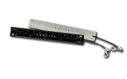 ○1/100、1/200、1/300、1/400、1/500、1/600 の計6種類の縮尺が刻まれた三角スケール