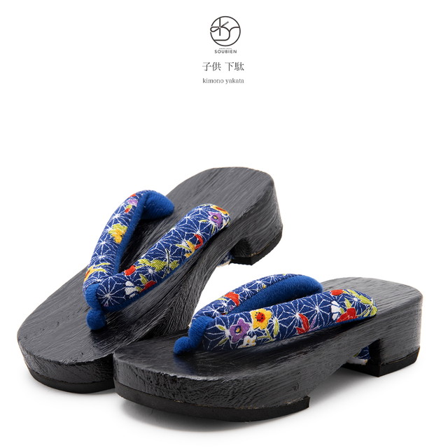 下駄 子供 浴衣 紺 ネイビー 黒 ブラック 花 フラワー 麻の葉 縮緬 ちりめん 塗り 女の子 女児用 桐 ジュニア 夏向け キッズ こども げた ゲタ 和装小物