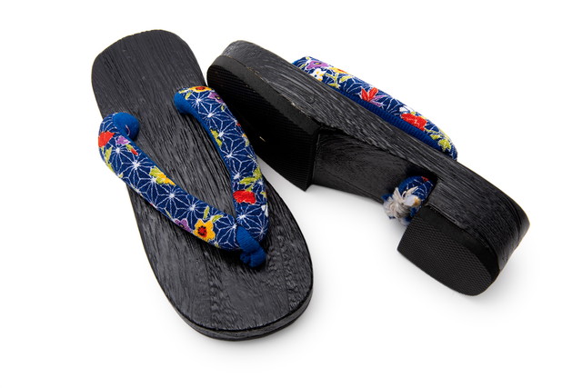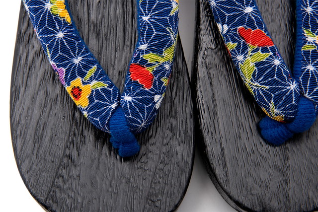 鼻緒は、レトロな雰囲気で着物に合わせやすい、縮緬(ちりめん)地に麻の葉に色鮮やかな小花が施されています。