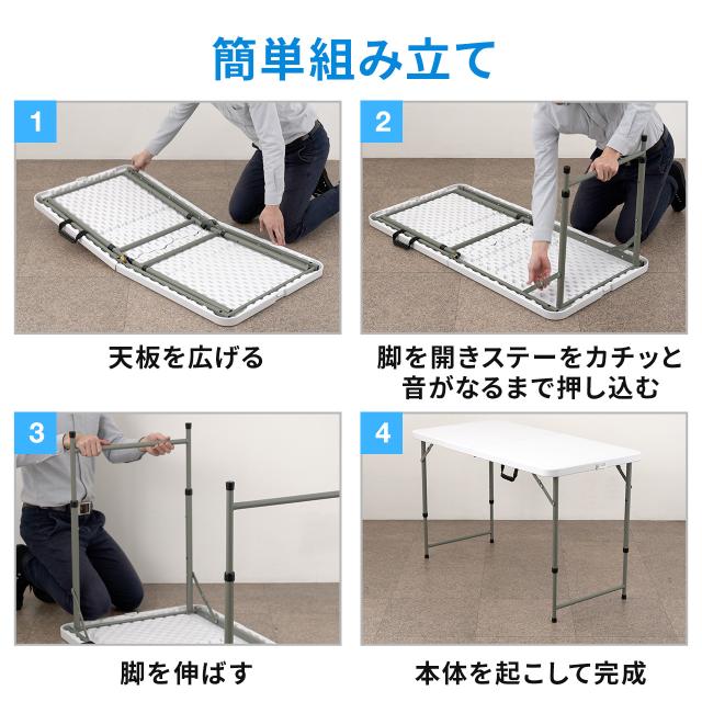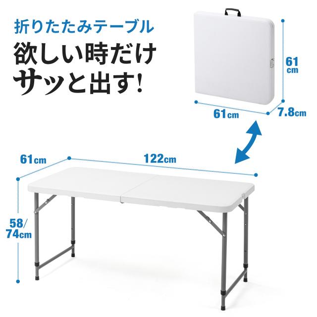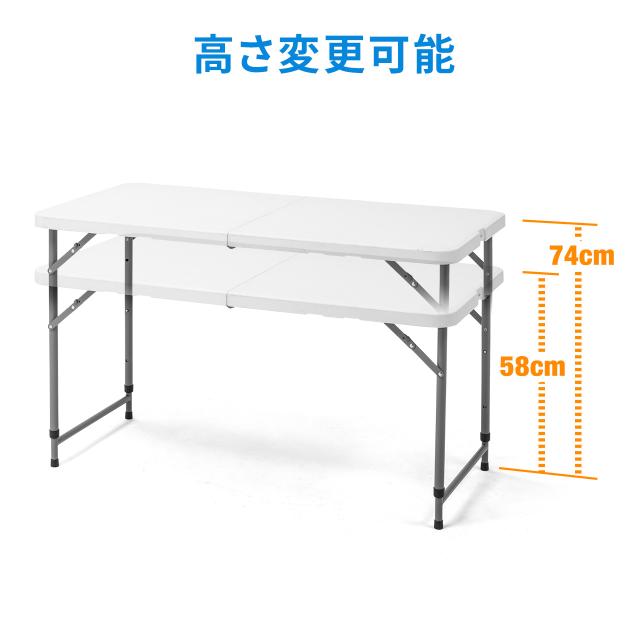 折りたたみテーブル 幅122cm 奥行61cm 樹脂天板 高さ変更 取っ手付き ホワイト[100-FD015W]
