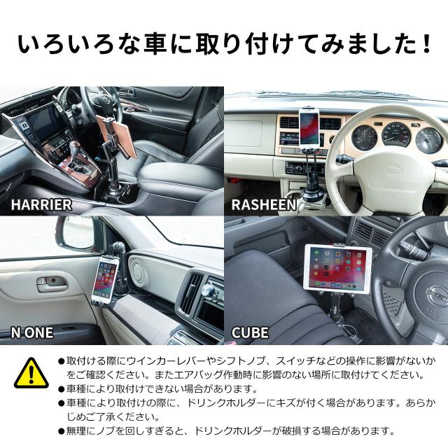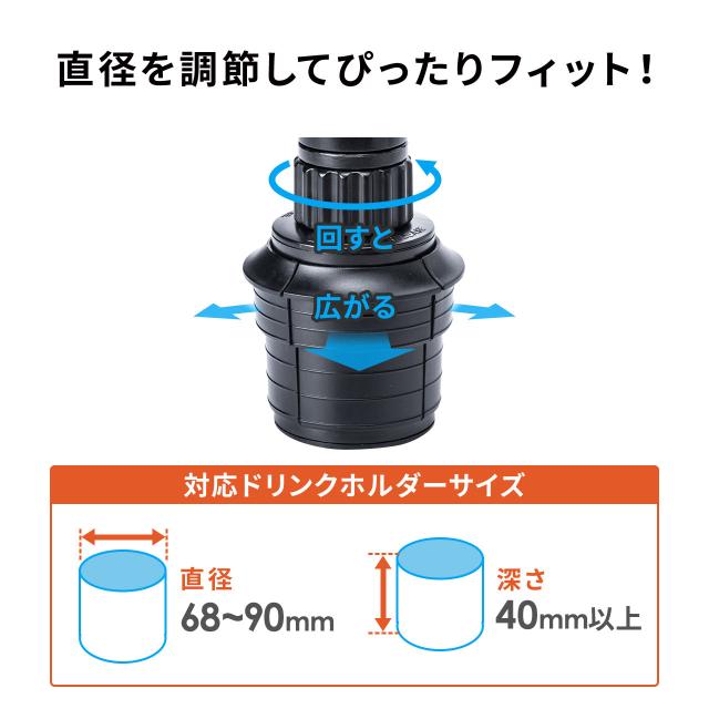 ■対応機器:幅もしくは高さが120〜230mm、重量750g以下のスマートフォン・タブレットなど■設置条件:内径68〜90mm、深さ40mm以上のドリンクホルダー