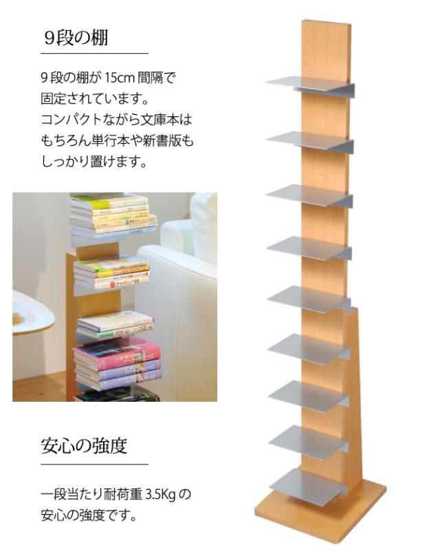 安心の日本製。30cm四方に置ける省スペース設計で置くところを選びません。一段当たり耐荷重3.5Kgの安心の強度です。9段の棚が15cm間隔で固定されています。コンパクトながら棚板サイズは幅19×奥行14cmあるので、文庫本はもちろん単行本や新書版もしっかり置けます。