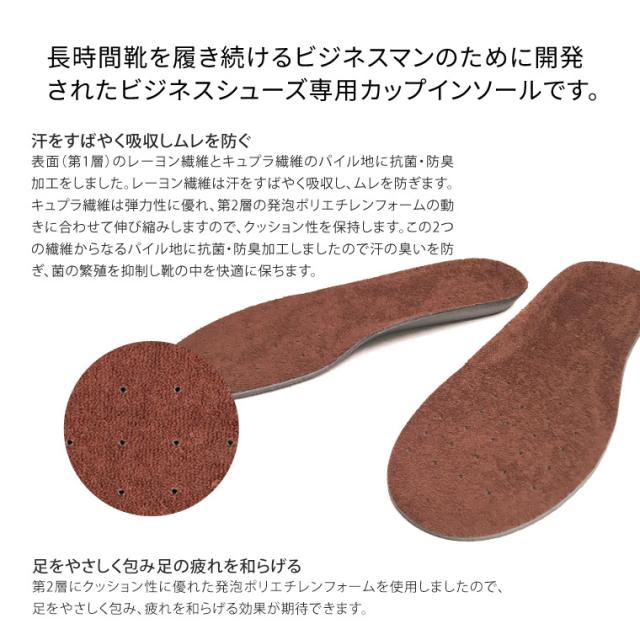 長時間靴を履き続けるビジネスマンのために開発されたビジネスシューズ専用カップインソールです。