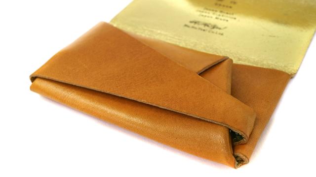 「袱紗(ふくさ)」をモチーフにし、上質な一枚革を折って成形。縫わずに最後に1点をボルト&ナットで留め付けるだけという、日本の美学が表現されたデザインです。ファスナーやボタンを使わず、レザー本来の風合いを最大限に活かしています。