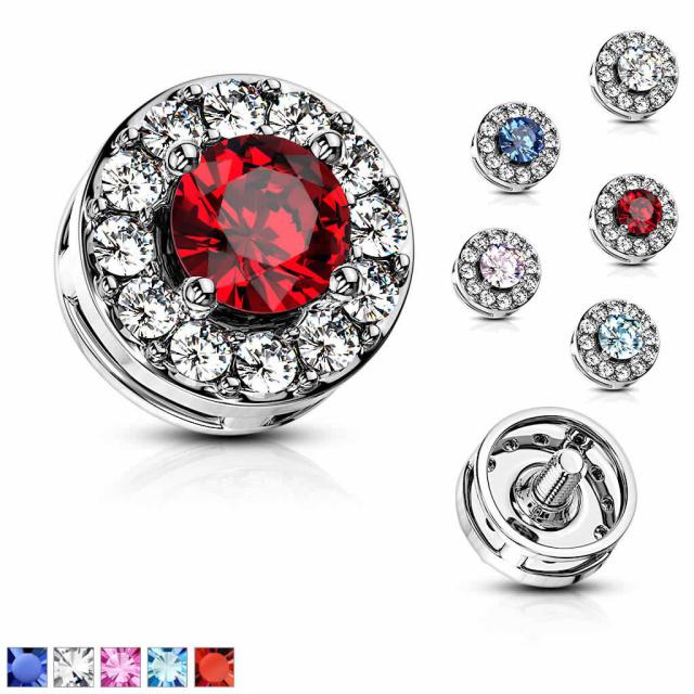 シルバーの台座に大きなクリスタル、サファイア、ピンク、レッド、アクアのジルコニアの周りを小さなジルコニアを配したの内ネジタイプのボディピアス用キャッチ。