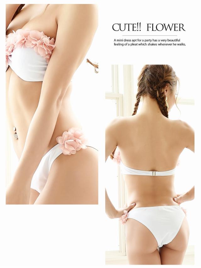 ☆ワンカラーのバンドゥビキニに3Dフラワーがポイントのキャバビキニは花びらフリルで可愛いさUPの無地レディース水着♪