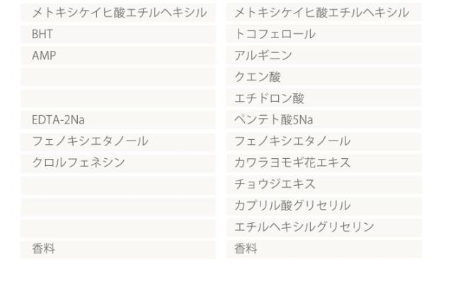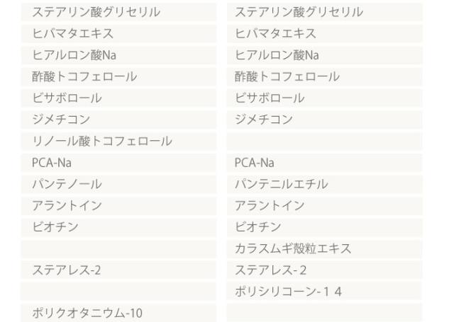 水、BG、アロエベラ液汁、サフラワー油、グリセリン、セタノール、ステアリン酸、マカデミアナッツ油、ステアリン酸PEG-100、ステ アリン酸グリセリル、ヒバマタエキス、ヒアルロン酸Na、酢酸トコフェロール、ビサボロール、ジメチコン、PCA-Na、パンテニルエチル、アラントイン、ビオチン、カラスムギ殻粒エキス、ステアレス-2、ポリシリコーン-14、メトキシケイヒ酸エチルヘキシル、トコフェロール、アルギニン、クエン酸、エチドロン酸、ペンテト酸5Na、フェノキシエタノール、カワラヨモギ花エキス、チョウジエキス、カプリル酸グリセリル、エチルヘキシルグリセリン、香料