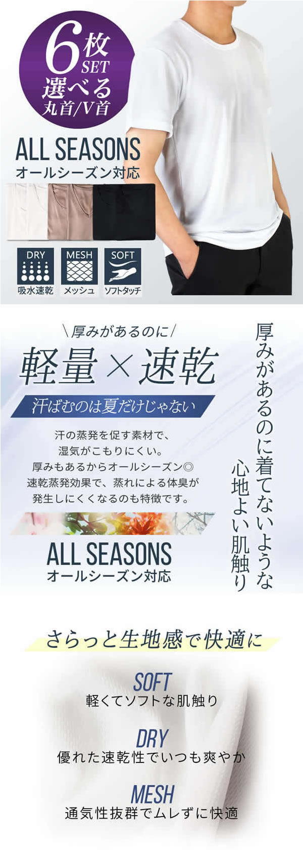 6枚セット インナーシャツ 下着 インナー メンズ ホワイト ベージュ Vネック oth-me-in-1545-3fix クルーネック 吸水速乾 メッシュ ソフトタッチ 速乾性 通気性 軽い 紳士 快適 丸首 V首 父の日