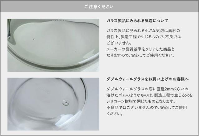 直火、オーブンでご使用いただけません/電子レンジで加熱しすぎたり、空焚きにならないようご注意ください/二重構造のため、手で触れる部分が熱くなくても中の飲み物が熱い場合がございます やけどには十分にご注意ください/ガラスの急冷は破損の原因となります 熱いうちに濡れた布で触れたり、濡れた場所に置かないでください/氷を勢いよく入れると内側のガラスが割れる可能性がございますのでご注意ください/洗浄の際はクレンザーやたわしを使用しないでください/商品底部にオリジナルのロゴマークが入っています/ヒビ・カケ・傷のついた製品は思わぬ時に破損し、ケガをするおそれがございますので使用しないでください