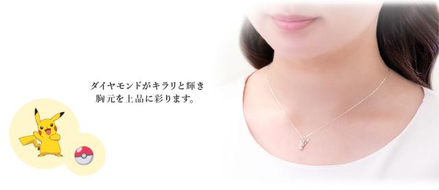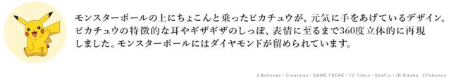 ピカチュウの特徴的な耳やギザギザのしっぽ、表情に至るまで360度立体的に再現しました。モンスターボールにはダイヤモンドが留められています。