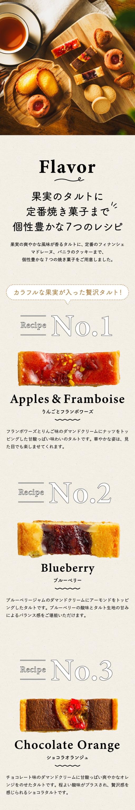 ●内容量:タルト(ショコラオランジュ・りんごとフランボワーズ・ブルーベリーのタルト)×各1、マドレーヌレモン×3、ハートフィナンシェ(キャラメル味)×3、サブレバニーユ×7、ティグレフレーズ×2