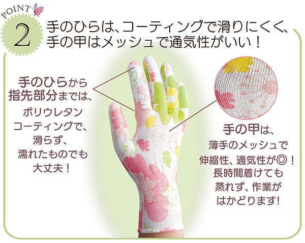 | 気分で選べるガーデニンググローブ4柄4双セット。手のひらから指先までは、ポリウレタンコーティングされており、鉢やスコップなども持ちやすく、滑りにくい!また手の甲は、薄手のメッシュで通気性が良く、長時間つけていても蒸れずに快適なため、インナー手袋としても使用できます! |