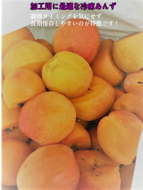 全国生産量1位の信州の初夏を彩るアンズの、長期保存できる冷凍品です。こちらの荷姿は約2kg入りです。外皮に擦れ傷や変形、奇形などのあるB級訳あり品のキズ部分をカットしてから冷凍保存してあるアンズです。加熱調理して潰してしまうようなジャム作りに適した規格です。冷凍してあるのですぐに加工処理できない方にもお勧めです。