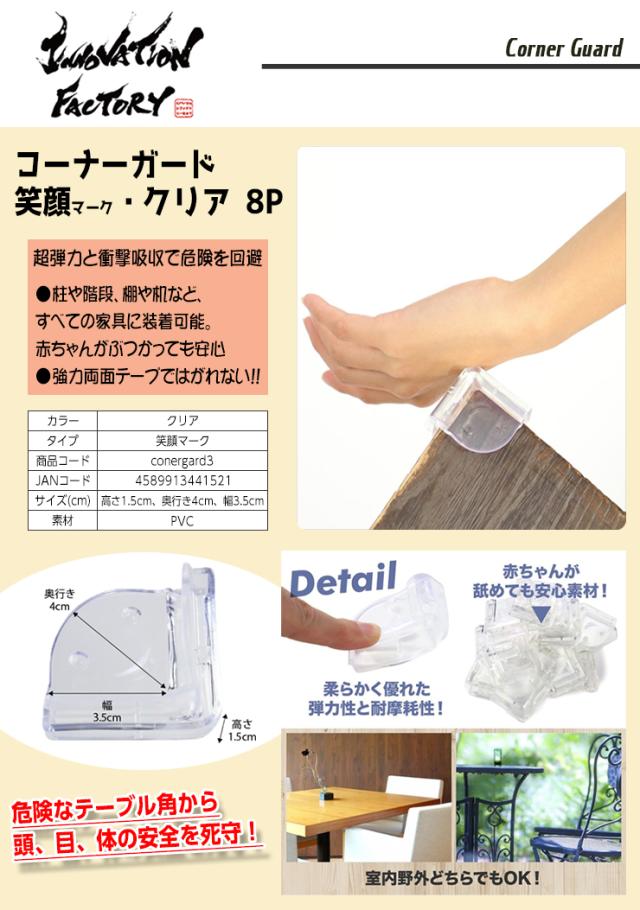 コーナーガード(笑顔マーク型)8個入り、両面テープ付きの商品です。期間限定にて特価価格で販売中です。割引価格の個数にも限りがございますので、お早めにどうぞ!当社の商品の検品につきましては、全商品1点1点チェック項目に基づき、専属検品スタッフが常駐し、確認しております。万全の体制を敷いておりますが、商品到着後、不具合や不明点などがございましたら、当社まで電話やメールにてご連絡頂けますと幸いです。当社でお取扱いの全商品につきまして30日保証付となっております。発送につきましては、提携の日本郵便より丁寧な梱包形態にてお届けをさせていただきます。追跡番号につきましても当社システム管理にて一元化しております。商品のお届け状況も全て確認が可能です。ご注文からお届け完了まで最後まで責任を持ってご対応させていただきます。