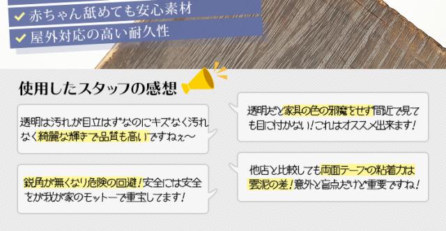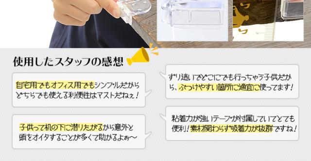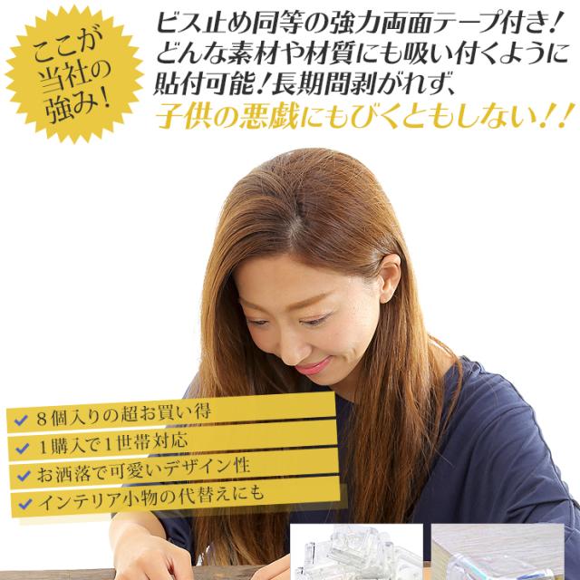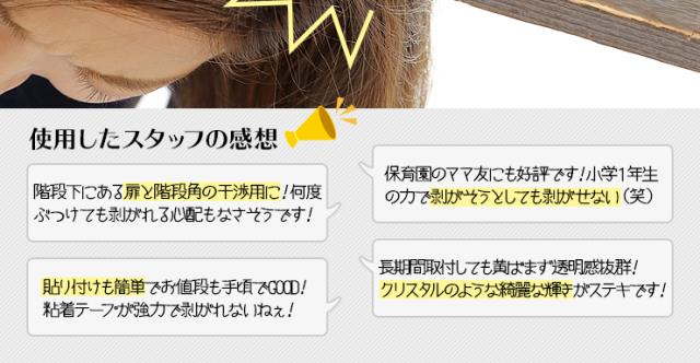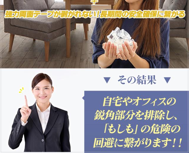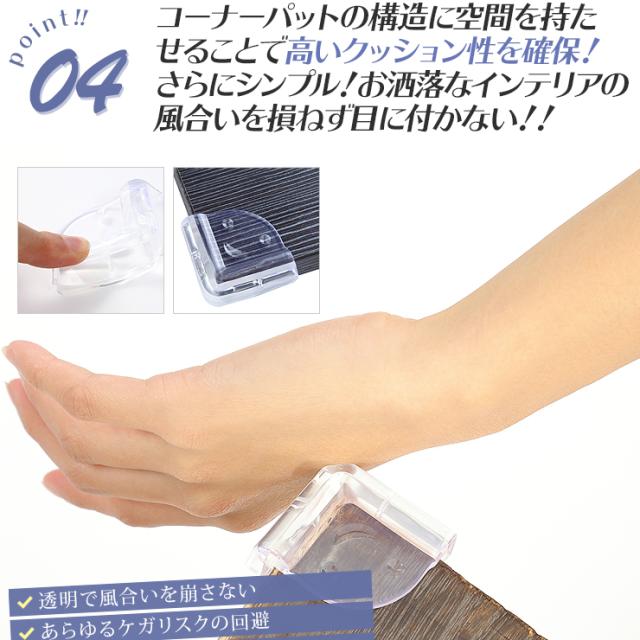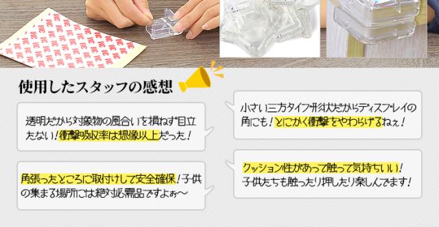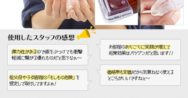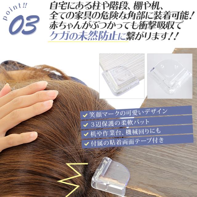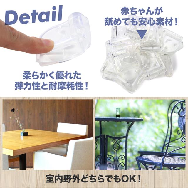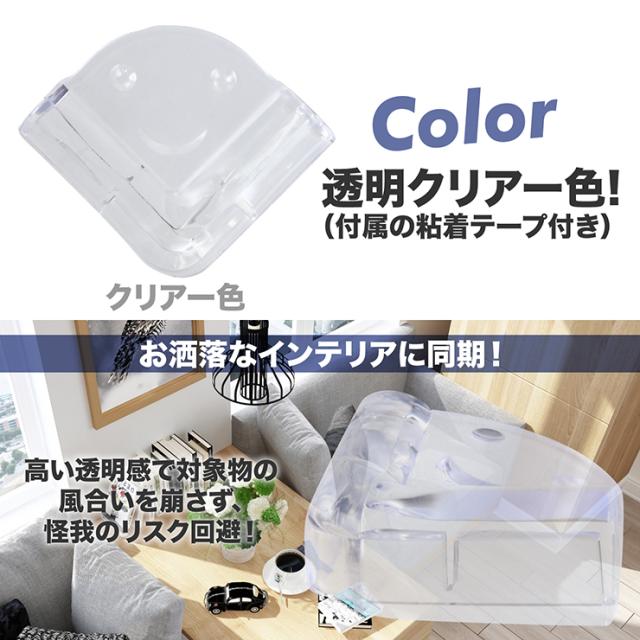 (素材)ポリ塩化ビニル(PVC)。PVCは、柔軟で弾力があり、衝撃に強いのが特徴です。また、汚れも拭き取るだけで綺麗に払拭出来ます。耐久性や耐疲労性、耐燃性も優れております。 (デザイン・カラー)無色透明タイプ。丸型。透明でシンプルなデザインは、家具の美観を損ねることなくお使いいただけます。粋でスタイリッシュなデザインをお求めの方には、是非オススメです。(サイズ・セット数)高さ:約2.5cm 幅:約2.5cm 上底部:直径約3cm 内角:約2cm。一般的な家具や机の鋭角に「ピッタリ」と取り付けられます。(※取付箇所の高さや幅に関わらず、角であるならば、高さ違い、幅違いも全てカバー致します。)1商品=8個入り。意外と必要な取り付け箇所は多いものです。1回で使い切らなくとも予備としても保管出来ます。大変お買い得な商品です。(特徴)商品は、柔軟性と弾力性に優れおります。赤ちゃんや子供が頭や身体をぶつけても怪我や思わぬ事故の未然防止に役立ちます。粘着テープも付属します。