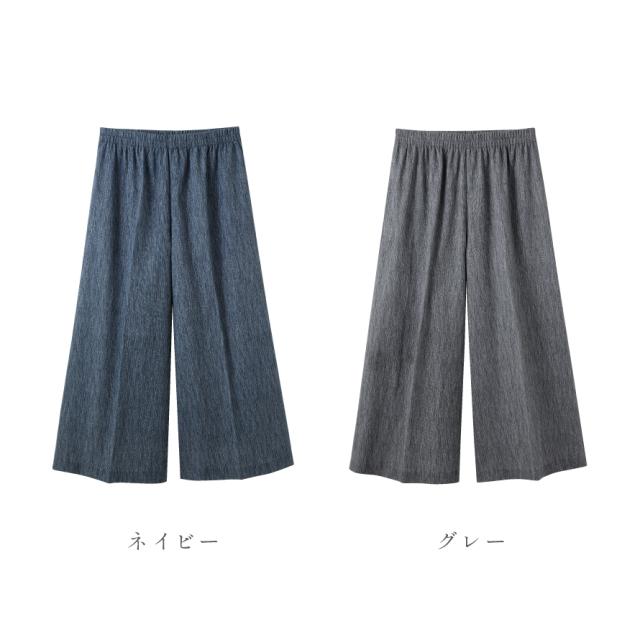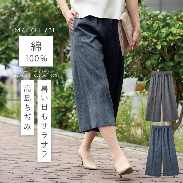 ワイドパンツ レディース ウエスト 総ゴム 春夏 涼感 涼しい ゆったり 大きいサイズ 7分丈 大きいサイズ おしゃれ 高島ちぢみ キュロットパンツ ネイビー グレー M L LL 3L 大きいサイズ 大きめ メール便対応