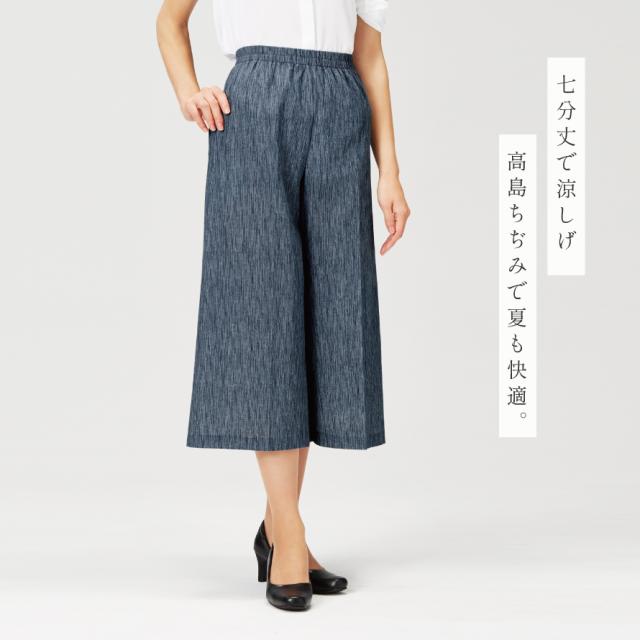 暑い日もサラサラ。汗でべとつかず快適に履くことができる高島ちぢみの7分丈ワイドパンツです。